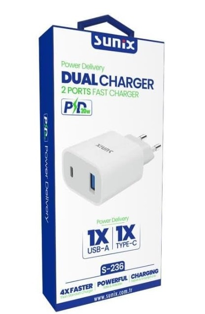 Sunix S236 Çift Çıkışlı Usb-S ve Type-C Sadece Başlık PD20W Ev Şarj Aleti
